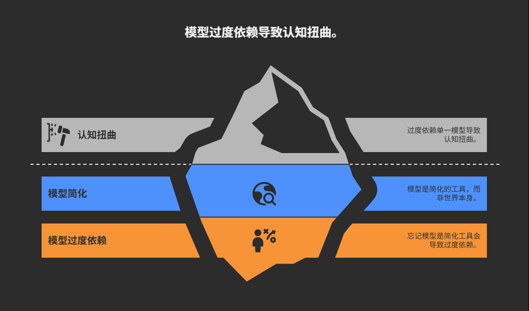 然而,模型的强大功能也带来了潜在的危险。我们常常忘记这些模型是“简化工具”,而非世界本身。当我们过度依赖单一模型时,我们的认知就会变得扭曲。正如那句谚语所说:“当一个人只握着一把锤子(单一模型),世界在他眼中会变成一颗颗钉子(认知扭曲)。”