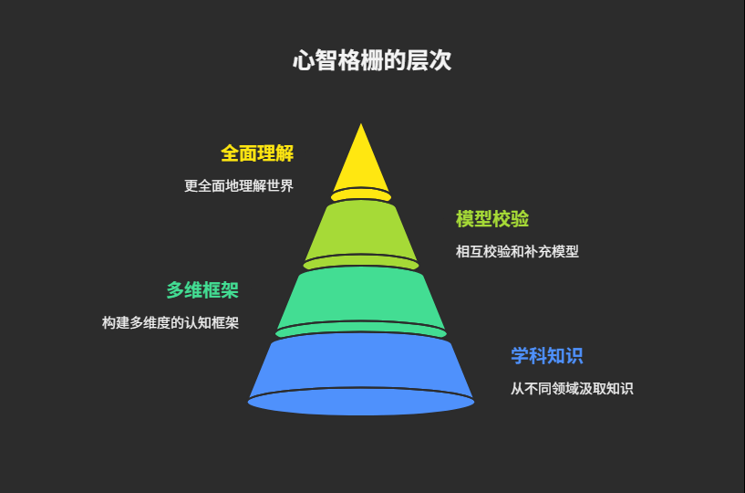 查理·芒格推崇的“心智格栅”是一种重要的思维方式。它鼓励我们从不同的学科领域汲取知识,构建一个多维度的认知框架。例如,我们可以用物理学理解系统稳定性,用生物学理解演化,用诗歌理解情感。通过不同模型之间的相互校验和补充,我们可以弥补单一模型的盲区,更全面地理解世界。