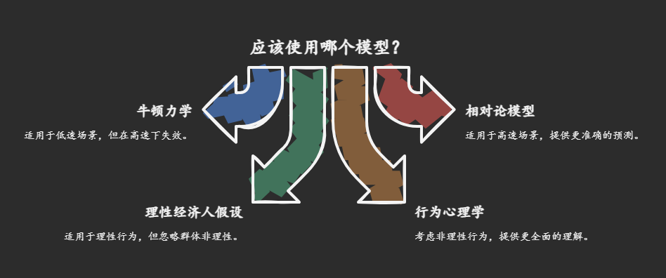 每个模型都应该自带“失效预警”。这意味着我们需要明确模型的适用范围和局限性。例如,牛顿力学可以标注“在高速领域失效,请切换相对论模型”,理性经济人假设可以标注“忽略群体非理性,需行为心理学补正”。通过这种方式,我们可以避免过度依赖单一模型,并在必要时切换到更合适的模型。