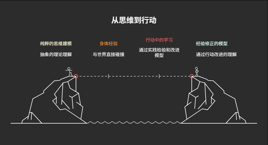 禅宗“吃茶去”或存在主义的“行动创造意义”,暗示有时需跳出思维建模,用身体经验与世界直接碰撞——这种碰撞又反过来修正思维模型。这意味着我们需要在行动中学习,通过实践来检验和改进我们的模型。