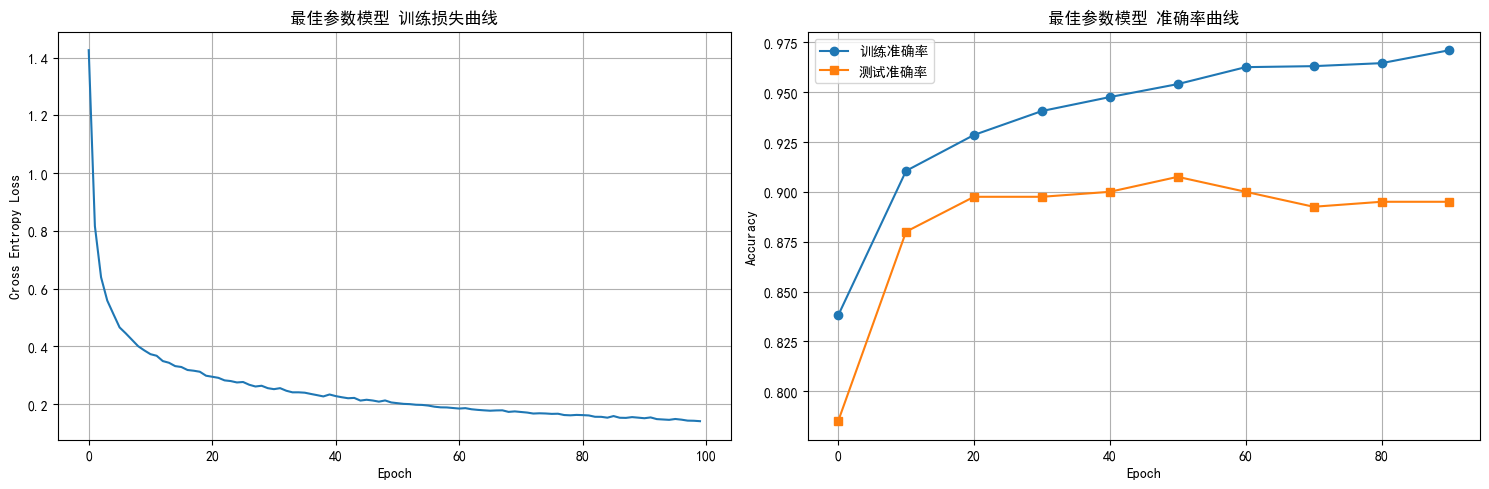 使用最佳参数训练100个epoch后,模型最终训练准确率达到97.25%,测试准确率为89.75%,最终损失为0.1404。