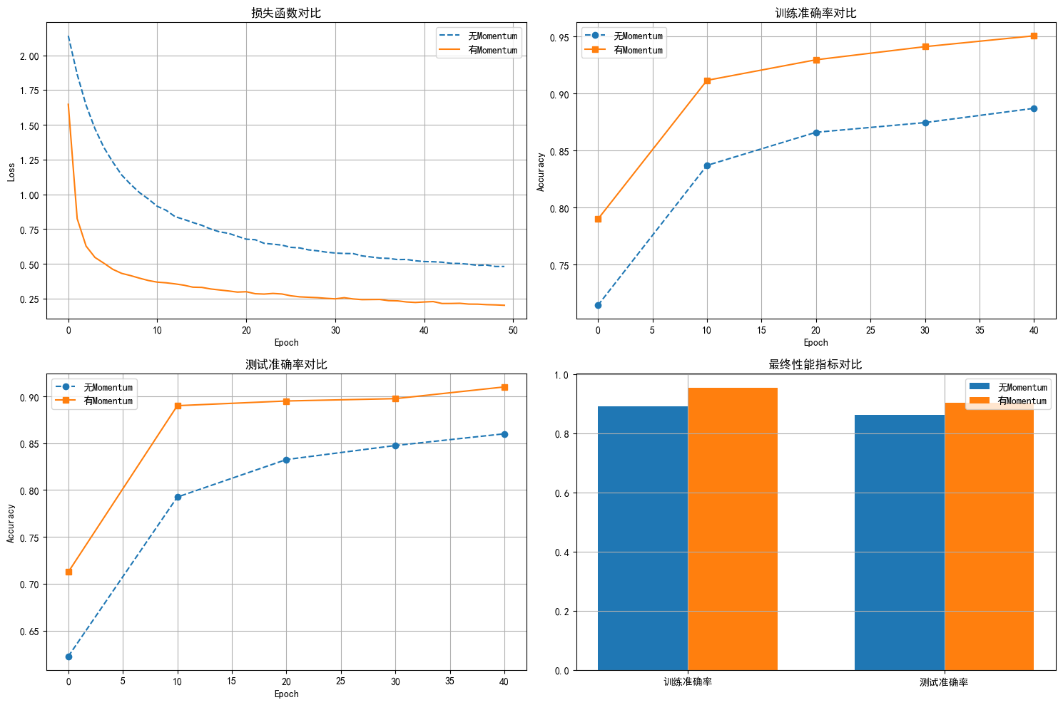 - Momentum优化能显著提升模型性能,测试准确率提高4.6%,损失降低58.1%,且不增加明显计算开销