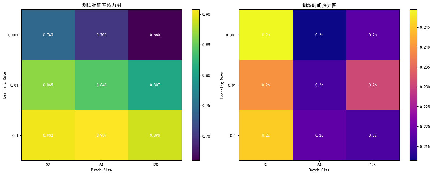 - 右图:训练时间热力图 - 颜色越亮表示训练时间越长 系统调整了学习率和批次大小两个关键超参数:
